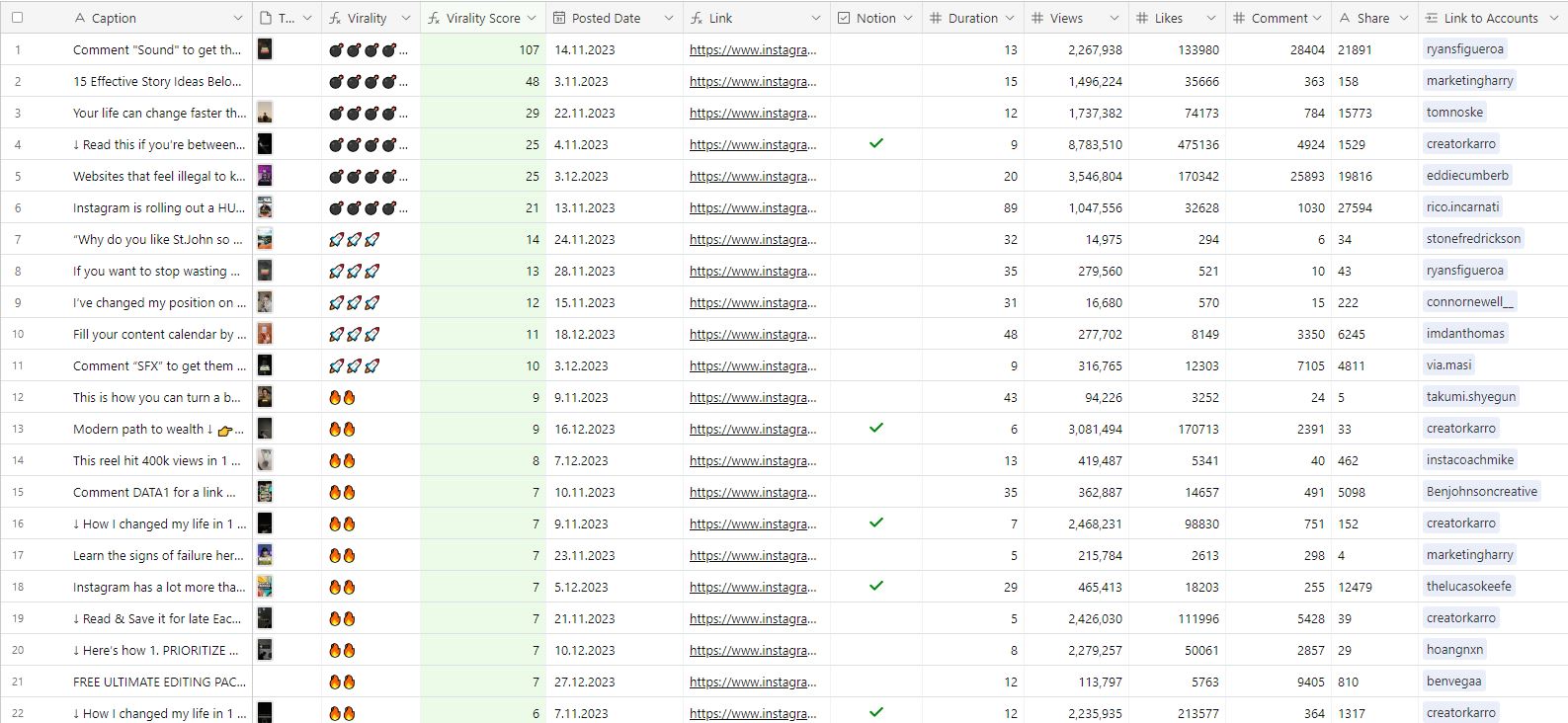 - You will then get an e-mail or telegram message every 5 days (6/month) with 30-50 viral reels. This list will contain 15+ metrics as well as an instant download link to get the original reel in full quality.